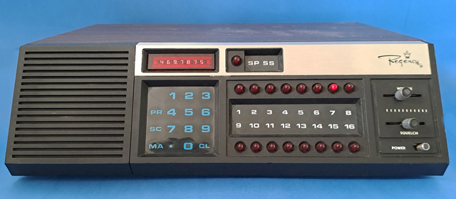 The first four Regency scanners shared all a common design language using small 7-digit LED displays borrowed from electronic pocket calculators and the "running light" channel LEDs. The cabinets for these four Regency scanners were made from chipboard with dark brown wood veneer.