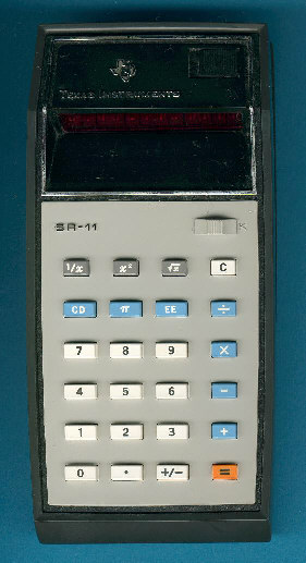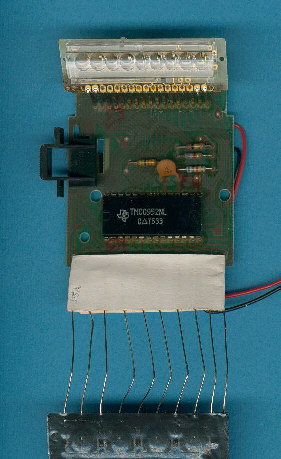The SR-11 was introduced September 1973 as the successor of the SR-10 scientific calculator. It uses 3 AA-sized NiCd-batteries and a 12-digit LED display. | You'll easily locate the 28-pin TMS0602 calculator IC surrounded by 4 display drivers. The 3 batteries are located under the LED display. | This picture without the batteries shows the small display board and all the tiny components necessary in an early TI calculator. Note: This is a rear view. |