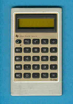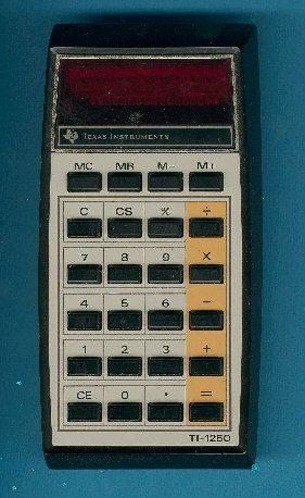 The TI-1250 was introduced June 1975 as the first one-chip calculator. Together with it's siblings millions of this design were sold. | You'll easily locate the 28-pin TMS0952 calculator IC. This picture gives you an idea of the keyboard with the small metal-domes pressed against wires. | Not too much components on the printed circuit board! The 9-digit LED-stick is located on top, the metal-domes of the keyboard are hidden under the black foil. |