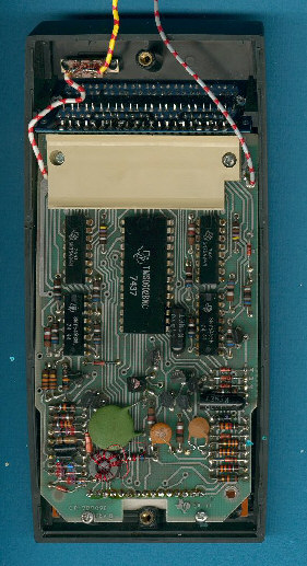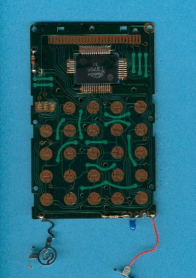 With the TI-1750 Texas Instruments entered April 1977 the market of LCD-calculators. Note: Design and manufacturing was done in Japan. | The 44-pin Quad-Flatpack calculator IC manufactured by Toshiba is located under the EPSON manufactured yellow-LC display. The calculator runs more than 3000 hours from 2 little coin batteries. | Two interesting items on this printed circuit board: It is one sided with thick "bridges" to give a second layer of connections. The keyboards consists of small conductive pieces pressed against the metal-fingers on the board. |