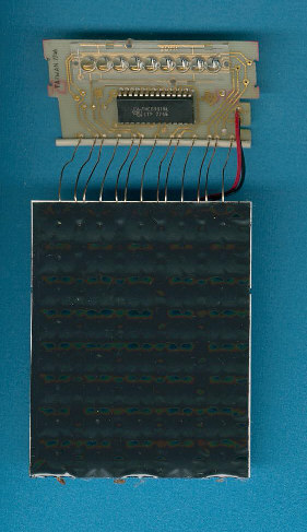The TI-30 was introduced June 1976 as the first scientific one-chip calculator. It was probably the best selling calculator ever. | You'll easily locate the 28-pin TMC0981 calculator IC. This picture gives you a perfect view of the x/y-matrix keyboard with the small metal-domes (x-line) pressed against wires (y-line). | The TI-1250 uses a small printed circuit board to accommodate the display, the TI-30 integrated even the calculator chip on the display board! |